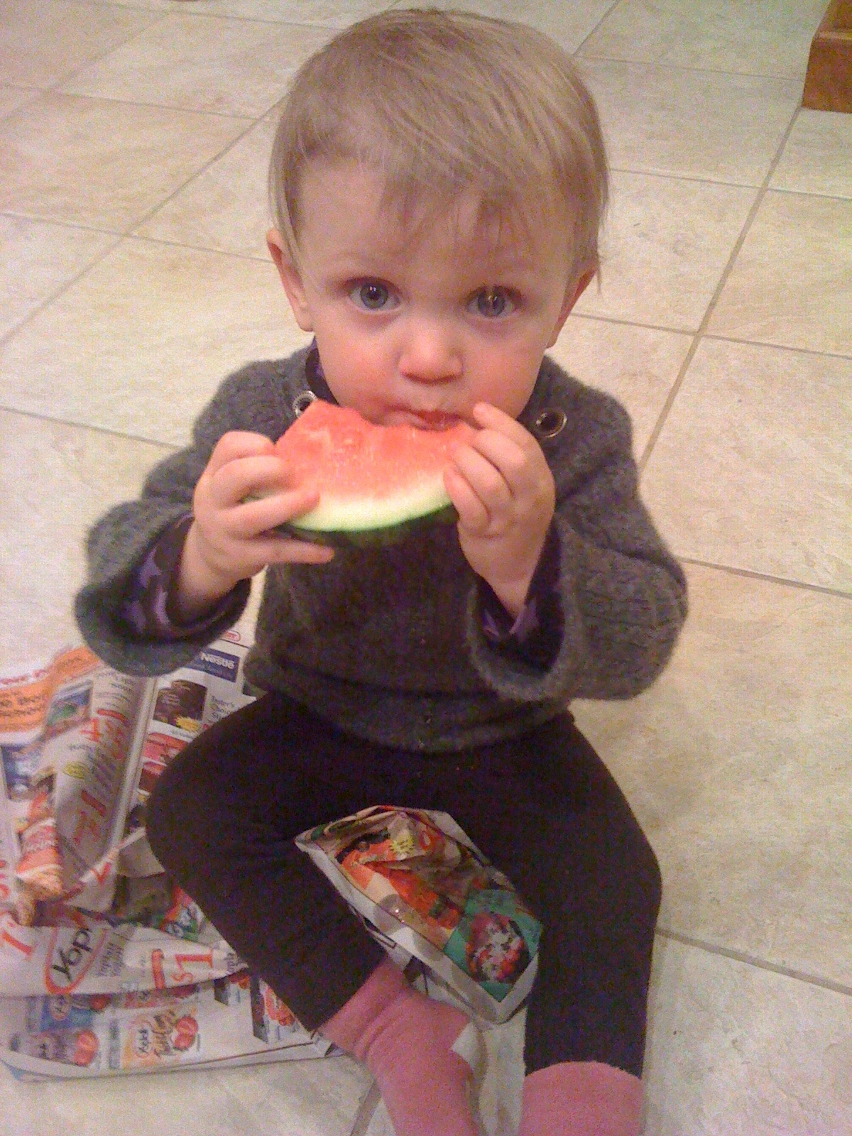 It works for us. Stella and Cody and I eat our share of health-nut favorites like fish and kale. I used to make baby cereal from a variety of grains and legumes, but during these heady days of toddlerhood I make oatmeal or “Ben’s Friday Pancakes” with buckwheat groats and steel-cut oats (the recipe contains no flour, but a little cane sugar) instead. Scrambled eggs with parmesan are a staple. Cauliflower and watermelon are two of her favorite foods. She loves beans–made with love from dried beans by yours truly or scooped from a can with love and added to pasta and tomato sauce. She loves my homemade mac n’ cheese (I use whole wheat pasta, usually) and refuses to eat chicken nuggets. Chocolate milk helped her take to a sippy cup. Recently, she devoured coconut rice. Avocado is a frequent side dish. Her eyes light up at a fresh, buttery croissant, not to mention cookies, and I’m known to throw a few chocolate chips her way now and then, just because. I suppose it’s one of the million different ways I show my love.