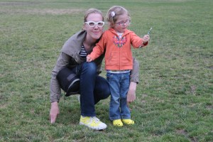 As I discussed with Mandi today, Stella uses her eyes together–she performs successfully with the quoits vectogram exercise. She can now catch a ball thrown to her. While just months ago she flat-out refused to look up and catch a slow-floating balloon, she now bats one around to herself, or plays catch with one, unprompted and just for kicks. Her toe-walking is now a fraction of what it was. The yoked prism goggles are now comfortable for her to wear, whether base up or base down, whereas getting her to wear them at all was once a Herculean task of mass distraction. She can see a new world in her periphery. There are too many good signs to list. Frankly, you can tell how well (or poorly) we’re doing by my appearance. I accessorize and wear skirts a lot more now. I can’t let Stella’s bouncy curls and chic glasses completely steal the show! Though, they always do. Stella collects compliments the way I collect freckles, and awkward silences.