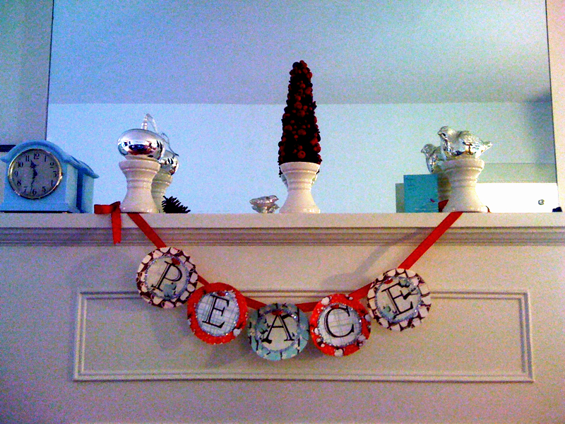 Our new tree bling.For the first several days, the tree was star-less. So I ordered a wonderfully simple star tree topper from Red Envelope, and it arrived during Stella’s nap early this week. I put it up atop the tree right away, admired it proudly for a moment, then promptly forgot about it. Not long after, Stella awoke from her nap. The first thing she did? Gazed up at her new best friend the Christmas tree, smiled, and with her sparkly blue eyes growing ever wider, pointed at the star in dramatic, overly excited fashion. She did the same when I hung my “PEACE” banner on the mantle. She not only smiled and pointed, but actually applauded. The banner isn’t exactly what I’d hoped it would be, but I did put some real work (not to mention money) into it, and the fact that Stella appreciated it so much almost brought tears to my eyes. She’s just so incredibly sweet.