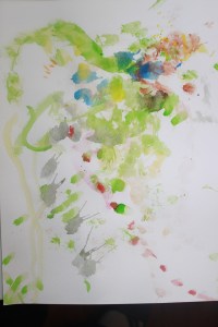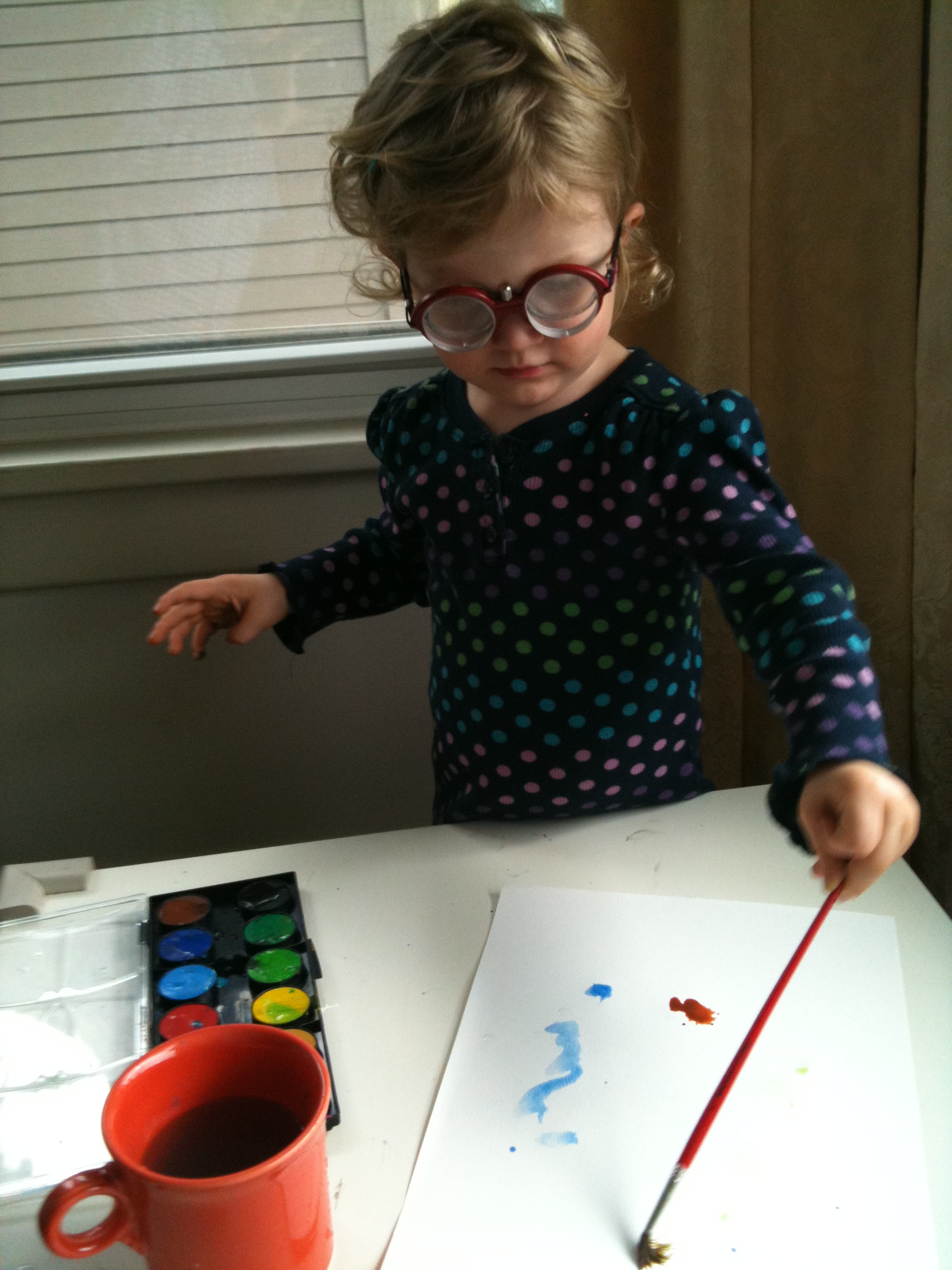 Stella’s Easter basket included a sweet set of watercolors and accompanying pad of paper. She’s used them every day so far, at her request, and as it so engages her, I’ve been putting the goggles on her while she paints. We’re starting to branch out, no longer limited to the brush that was included with the set. Fingers, Q-tips, and other brushes and random household items are coming into creative play. Relatedly, today’s “watercolor goggle time” turned into “manic sprinting while tossing cotton balls all over the place goggle time.”