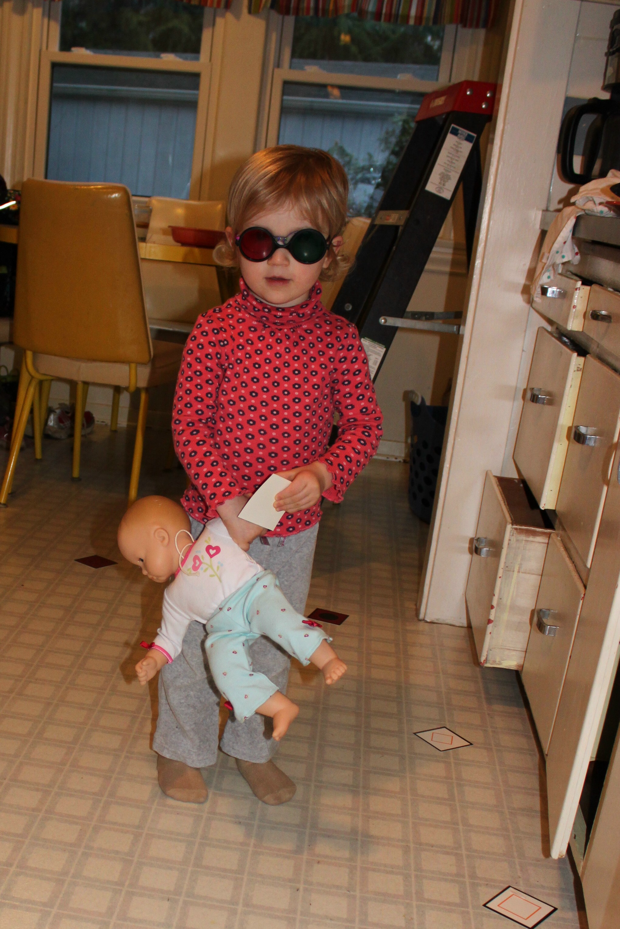 In the end, due to her gains in 3D vision and acuity as witnessed in the optometrist’s office, and even the ophthalmologist’s thumbs up assessment of Stella’s visual status, we’ve decided to continue vision therapy for another few weeks, at least. With an emphasis on use of the yoked prism goggles, which merit an entire post (coming soon), and more physical exercises that engage the vestibular system and body as they relate to and inform vision, from what I gather, helping Stella’s brain devise a more accurate map of space and her place in it. Stella enjoys those activities more, anyway. Bouncing, rolling, running? She’s in! Donning red/green glasses and slowly scanning the kitchen floor for matches, MFBF style? She’s so done with that particular game. She used to get 15 matches in one shot, now I’m lucky to get five reluctant matches worth of cooperation and sometimes she refuses completely and we both end up in tears. So I have to roll with it and be more flexible than ever. Putting those cards on the wall over the couch and letting her bounce around while searching does help make it more novel and fun. But I’m not sure that exercise is worth it anymore. Stella’s vision therapist agrees and is going to move us along to some new MFBF exercises to build upon this work and mix things up. We really like her–she’s had letters thrown at her, cards torn out of her hands, and shrill, blood-curdling screams shatter her eardrums, yet she keeps a cool head at all times. Me? Not so much. I sweat during those appointments to the degree where I stash deodorant in the diaper bag.